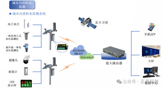 城巿内涝积水在线监测主要用于监测城市道路低洼处、隧道、立交桥下积水状况。采用物联网概念整合监测传输技术,通过电子水尺、激光水位计等传感器,自动采集积水水位,一方面通过LED显示屏提醒过往车辆,另一方面通过无线数据传输,将积水数据上传云服务器软件平台,通过网站和手机端,为政府部门和公众提供基于位置的积水深度实时监测和预警,为政府决策、指挥调度提供靶向数据支撑。